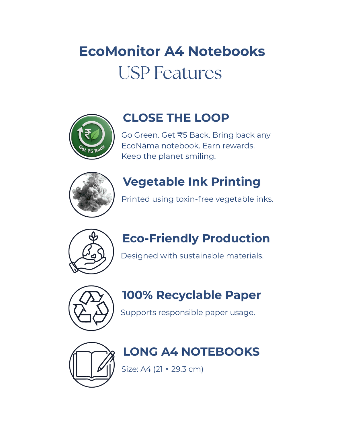 EcoNama notebooks are more than just your usual stationery, they’re your segue into an eco-conscious choice. Each notebook is crafted to minimize environmental impact while maximizing quality. Our vegetable-based inks, water-based varnishes, & eco-friendly adhesives ensure that every page helps the planet breathe easier while meeting the aspired quality. Certified by FSC & ISO standards, we ensure that for every tree harvested, multiple saplings are planted—creating a cycle of renewal that keeps forests thriving for generations. Sustainability is beyond just production, it’s about thoughtful actions. Through our ‘Return After Use’ initiative, you can return used notebooks to be recycled into new creations, giving the notebook a second life, all while earning ₹5 for every return. We do this to  foster responsible consumption habits. By choosing EcoNama, one classroom can save up to 10 trees per semester! Imagine the impact when schools, businesses, & communities come together!